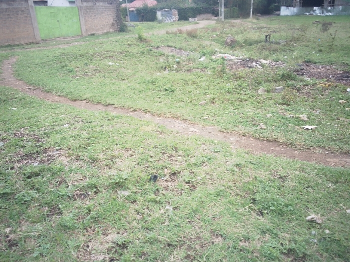 This image depicts a sparsely vegetated open area in Juja ward, Kenya. A narrow, unpaved dirt path, approximately 0.5 to 1 meter wide, meanders through a field of short green grass and weeds, extending from the foreground into the midground. To the left background, a concrete block wall supports a bright green metal gate, behind which additional structures are partially visible. In the right midground and background, scattered refuse, including white and dark objects, is visible amidst taller weeds and some bare earth. Further in the right background, a structure with a red-tiled roof is partially obscured by trees, and corrugated metal sheets are visible, indicating potential construction materials or debris. No individuals, animals, or specific actions are discernible within the frame. The environment appears to be an undeveloped or neglected plot of land bordered by residential or semi-developed properties.