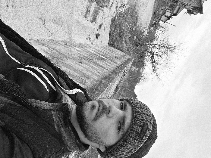 A black and white image features a male subject in the foreground, positioned to the right, engaged in a self-portrait. He has a full beard and mustache, wears a dark knitted beanie with a label, a dark outer jacket with a textured collar, a dark zipped hoodie with two vertical white stripes on the front, and a lighter-toned garment underneath. His gaze is directed towards the viewer with a neutral expression. Behind the subject, a concrete retaining wall extends diagonally from the lower left towards the mid-right. To the left of the wall, an unpaved upward slope is visible, covered with dry earth or light frost. On this slope, bare trees and sparse vegetation are present. In the upper left background, multiple older-style buildings with visible roofs and windows stand on the hillside. The sky overhead is overcast. The scene is located in the city of Yablanitsa, Bulgaria.