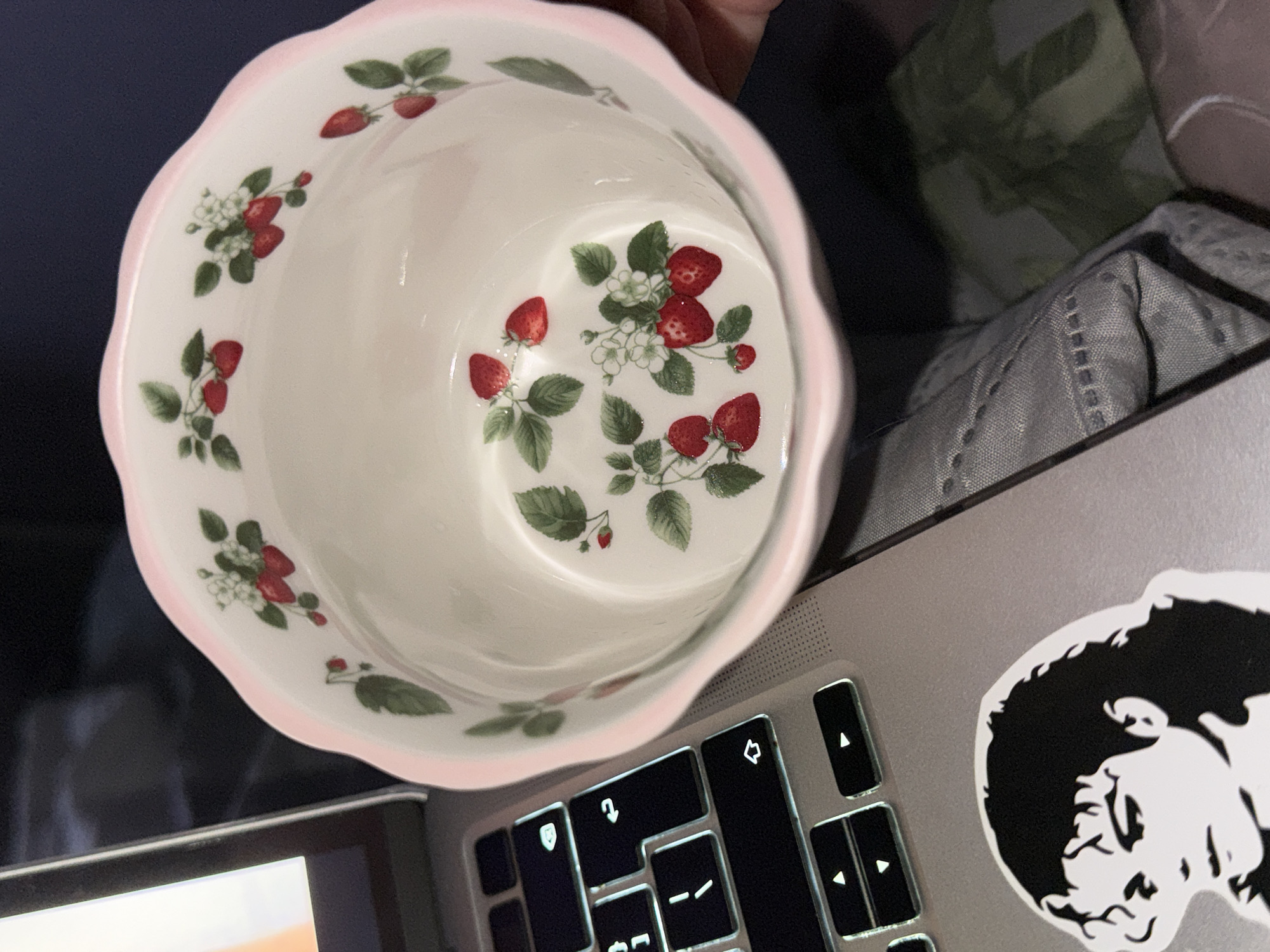 - "A white ceramic bowl with a scalloped, light pink rim is centrally positioned, resting partially on a silver-colored laptop keyboard" by FM-r2AQ53, licensed under CC BY 4.0
