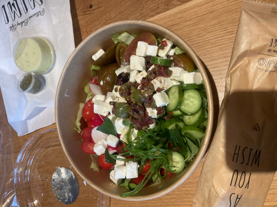 The image displays a meal from "MIMI Patisserie Bakery Cafe" on a light-colored wooden surface. The central object is a large salad contained within a round, brown, disposable bowl. The salad consists of a bed of lettuce, halved red cherry tomatoes, sliced radishes, cubed white feta cheese, sliced green cucumbers, a mix of green and dark olives, and chopped sun-dried tomatoes, along with thin strips of a green leafy vegetable. To the upper right of the salad bowl, two small, clear plastic containers with lids are present on a white paper bag. One container holds a dark green, granular substance, and the other contains a creamy, light green dressing. The visible text on the white bag confirms the establishment as "MIMI Patisserie Bakery Cafe," located in Hod HaSharon, Israel. In the lower portion of the image, part of a brown paper bag is visible, displaying the text "AS YOU WISH" and a small heart symbol. A clear plastic lid, likely for the salad bowl, with a metallic circular sticker, rests on the wooden surface in the upper left background. No individuals or active interactions are depicted in the scene; the focus is solely on the food and its packaging.