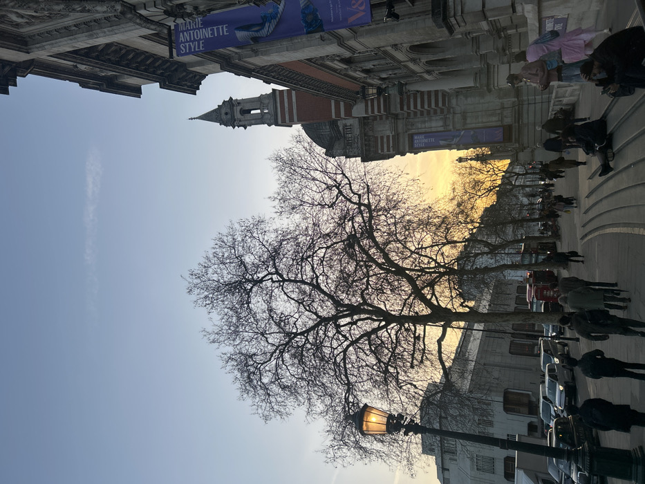 The image depicts an urban street scene at twilight in South Kensington, London, United Kingdom, specifically outside the Victoria and Albert Museum (V&A). The V&A's ornate stone facade, a distinctive red-brick tower with a conical roof, and two vertical purple banners displaying "MARIE ANTOINETTE STYLE" and the V&A logo dominate the right side of the frame. The sky above transitions from light blue to a vivid orange and yellow gradient at the horizon. Several large, bare deciduous trees are silhouetted against the sky, with one prominent tree in the left-center. An illuminated, ornate black streetlamp stands in the lower-left foreground. The paved sidewalk extends from the foreground, populated by numerous pedestrians. Multiple individuals are walking away from the camera on the left side of the sidewalk, while others are seated or standing on curved stone steps or benches located in front of the V&A on the right. Individuals are dressed in various forms of outerwear, including coats and jackets. The adjacent roadway to the left of the sidewalk contains parked and moving vehicles, including a red double-decker bus in the midground and a black London taxi partially visible in the foreground. Buildings with simpler architectural styles line the street in the background to the left.