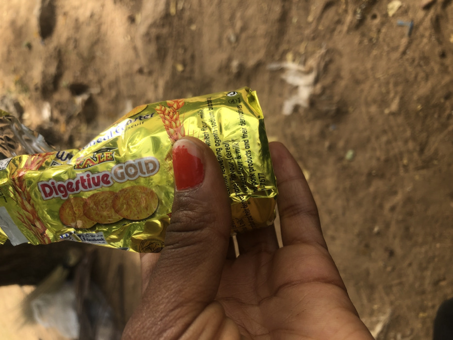 A close-up, outdoor image captured in Dutsinma B, Nigeria, depicts a dark-skinned human hand holding a small, crumpled, golden-yellow foil package of "Digestive GOLD" biscuits
