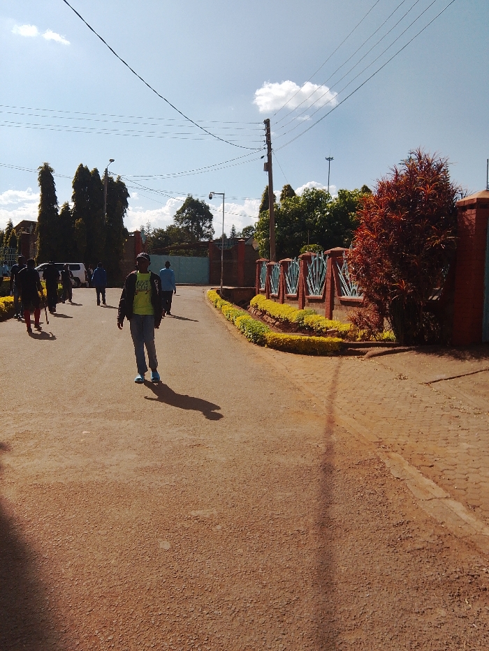 The scene depicts an outdoor environment in Karingani ward, Kenya, under a clear blue sky with a single distinct cumulus cloud. Bright sunlight casts long shadows, suggesting mid-morning or late afternoon. **People:** Approximately 7-10 individuals are present. In the central foreground, a man wearing a dark jacket over a light-colored t-shirt, dark trousers, and light-blue footwear walks towards the camera. His shadow extends diagonally behind him to the left. In the mid-ground to the left, a group of five to seven individuals, mostly wearing dark clothing, walk away from the viewer along an unpaved road section. One person in this group carries a stick or staff. Additional figures are visible in the background near a gate, some in blue shirts. **Subjects and Objects:** * **Roadway:** The ground consists of a reddish-brown, unpaved surface in the foreground and left mid-ground, transitioning to a paved, asphalt-like section that curves rightwards. A sidewalk composed of interlocking reddish-brown pavers is visible on the far right. * **Fence and Vegetation:** Along the right side of the paved road, a brick wall fence with integrated light-blue, ornate metal panels is present. In front of this fence, a low, manicured hedge with bright yellow-green foliage is visible. Immediately to the right of the foreground, a large shrub with reddish-brown foliage stands by the fence. In the background, multiple tall, dark-green trees (resembling cypress) and other green deciduous trees are prominent. * **Utility Infrastructure:** A tall, dark wooden utility pole with multiple crossarms and overhead wires stands on the right side of the paved road, extending into the upper right sky. Another utility pole with a street light fixture is visible on the left side, among the tall trees. A smaller pole with a security camera is positioned further back on the right, near the gate. * **Structures:** In the background, a large, light-blue metal gate, flanked by brick pillars, marks an entrance or exit point. A white van is partially visible behind the group of people on the left mid-ground. **Actions and Interactions:** Individuals are primarily engaged in walking. No direct interactions between individuals are discernible.
