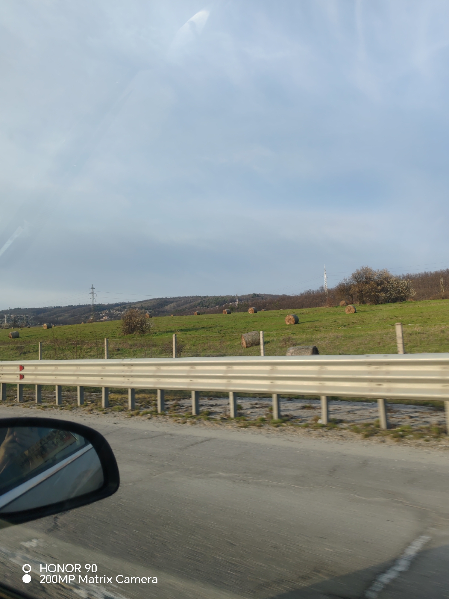 The image depicts a roadside scene, likely taken from a moving vehicle. A silver metal guardrail runs horizontally across the mid-ground. Behind the guardrail, a grassy field slopes gently upwards towards a tree line in the distance. Several hay bales are scattered across the field. Power lines and utility poles are visible in the background. A side view mirror of the vehicle occupies the lower left corner of the image. The sky is overcast. The location appears to be rural. No people are visible. The image is tagged with "HONOR 90 200MP Matrix Camera," suggesting it was taken with that mobile device. The location is Rajana, Bulgaria.