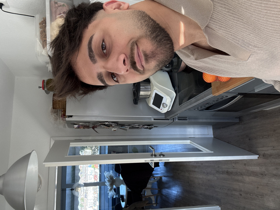 An interior image depicts a male individual in a kitchen environment in Remscheid, Germany. The subject, a male with dark brown hair styled with volume on top and a faded undercut, a full beard, and a mustache, is captured in a headshot, looking directly at the camera. He wears a beige or light brown textured collared shirt. The kitchen features white walls, light wood-patterned laminate flooring, and a gray countertop with an integrated electric stovetop and oven. A white and silver food processor (Thermomix-like appliance) is visible on the counter. To its left, a stainless steel refrigerator is adorned with various small items. Above the refrigerator, multiple storage containers, including plastic bins with contents and a glass jar with a red lid, are stacked. On the counter to the subject's right, a wooden cutting board holds two orange fruits in a mesh bag. A silver pendant light fixture hangs from the ceiling in the upper left of the frame. To the left of the subject, a white door with a glass panel is partially open, revealing an adjoining room. This room, also with light wood-patterned flooring, contains a round white table with dark chairs. A white vase holding white feathery decorative items is centrally placed on the table. Beyond this room, a large window or glass door offers an external view of residential rooftops under a bright sky, indicating daylight conditions.
