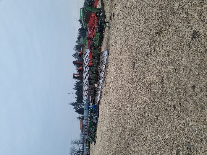 An outdoor storage area in Ovcharovo, Bulgaria, is depicted under an overcast sky. The foreground is dominated by a light-colored gravel ground surface. In the midground, a substantial collection of agricultural implements, primarily plows and cultivators, are densely arranged. These machines exhibit various colors, including green, red, and orange, with some featuring blue components. A light dusting of snow or frost is visible on the upper surfaces of many of the implements. No individuals are present. The background features a line of dark coniferous trees and a few bare deciduous trees. To the far left, a structure with a reddish-brown tiled roof and light-colored walls is partially visible. A light-colored fence or barrier runs horizontally across the mid-background. The sky is uniformly light gray.