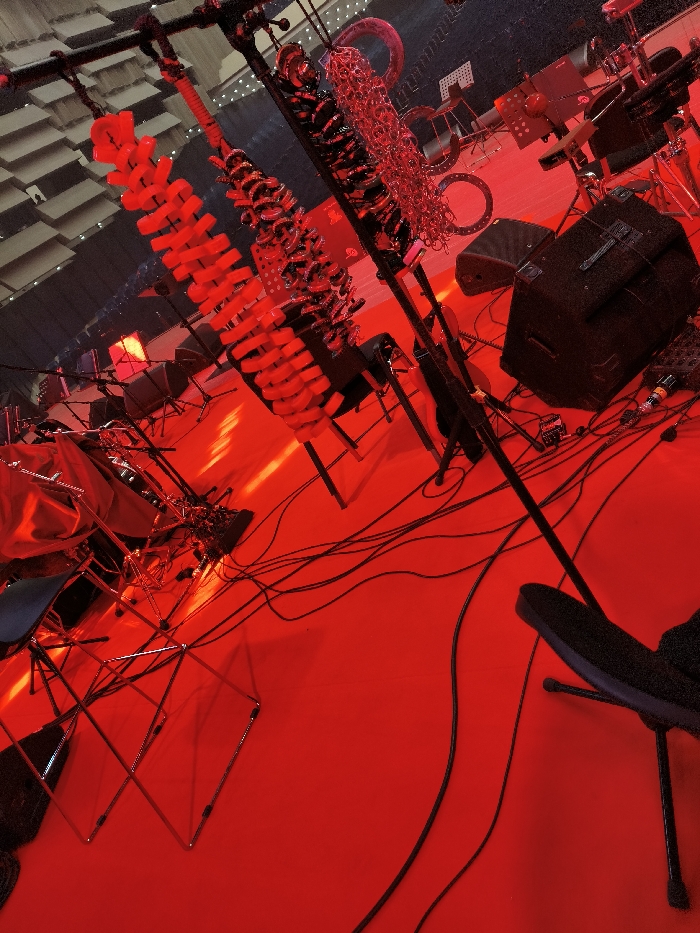 This image depicts a wide-angle view of a stage area within the Štark Arena (formerly Belgrade Arena) in New Belgrade, Belgrade, Serbia. The scene is illuminated predominantly by a red light source, casting a strong red hue across the entire stage floor and objects. In the foreground, a black stool with a metallic base is partially visible on the right. Numerous black audio and power cables are sprawled across the red floor, extending towards various pieces of equipment. Centered in the midground, a rigging system features two vertical lines of bright orange-red, tubular or block-like percussive elements, and two vertical lines of metallic, ring-like or chain-like percussive instruments, all suspended from horizontal bars. Surrounding these instruments are multiple black microphone stands and music stands with sheet music. To the right, a large black audio speaker box and a smaller wedge-shaped stage monitor are positioned on the floor, entangled with cables. In the background, parts of a drum kit are discernible. Several black folding chairs with metallic frames are scattered around the stage. The upper portion of the image reveals the distinct, multi-paneled ceiling structure of the arena, indicating a large indoor performance venue. No individuals are present in the scene. The overall impression is that of a stage prepared for or recently used for a musical performance.