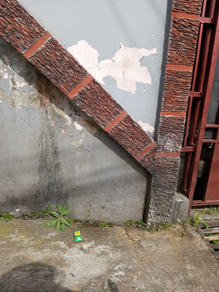 The image displays an exterior scene in Ciherang, Indonesia, focusing on a weathered building wall and concrete ground under direct sunlight. The wall features a light blue-gray upper section with extensive paint peeling, exposing lighter patches underneath, and a darker gray lower section with visible staining. Two decorative architectural elements with a reddish-brown, bark-like texture are present: one runs diagonally from the upper-left to the center-right, and the other is a vertical column on the right, connecting with the diagonal piece. Both elements exhibit horizontal darker brown banding. To the far right, a partial view of a reddish-brown metal gate or door frame with a grid pattern is visible. The ground consists of worn, stained concrete. A single green plant with broad leaves grows from the concrete near the lower-left wall, and smaller green weeds line the base of the wall. A crumpled piece of green, yellow, and white litter, appearing to be a snack wrapper, lies on the concrete near the plant. Shadows from the architectural features and an unidentified object in the lower-left are prominent, indicating daytime conditions. No persons or active events are depicted.