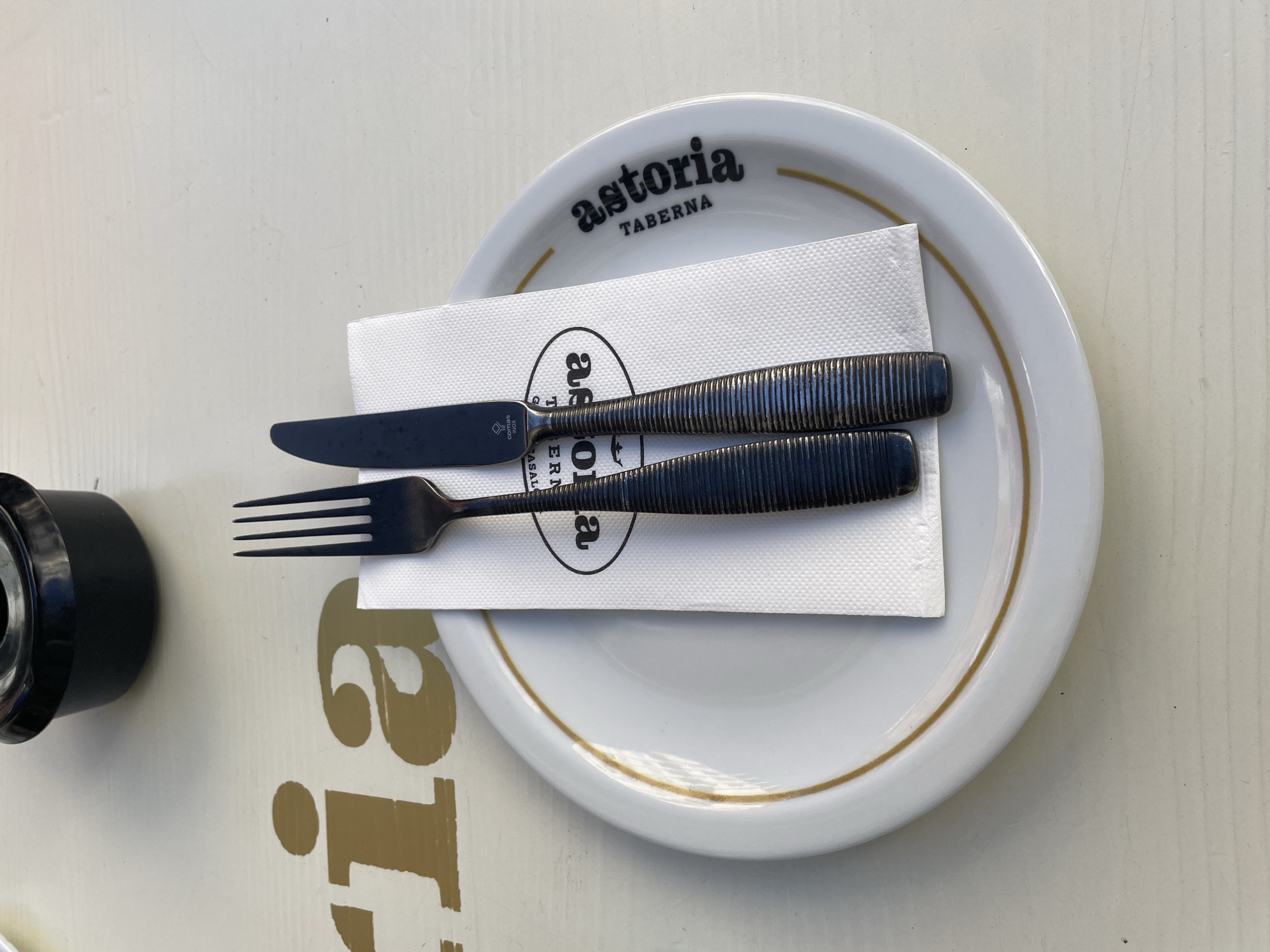 The image is a close-up shot of a table setting at Astoria Taberna, a restaurant in Málaga, Spain. A white plate with the restaurant's name in black lettering and a gold rim holds a folded white napkin. A dark-colored knife and fork are placed on top of the napkin. To the left, a black container, possibly for condiments, is partially visible. The table surface is light-colored with gold-colored lettering, presumably part of the restaurant's branding.