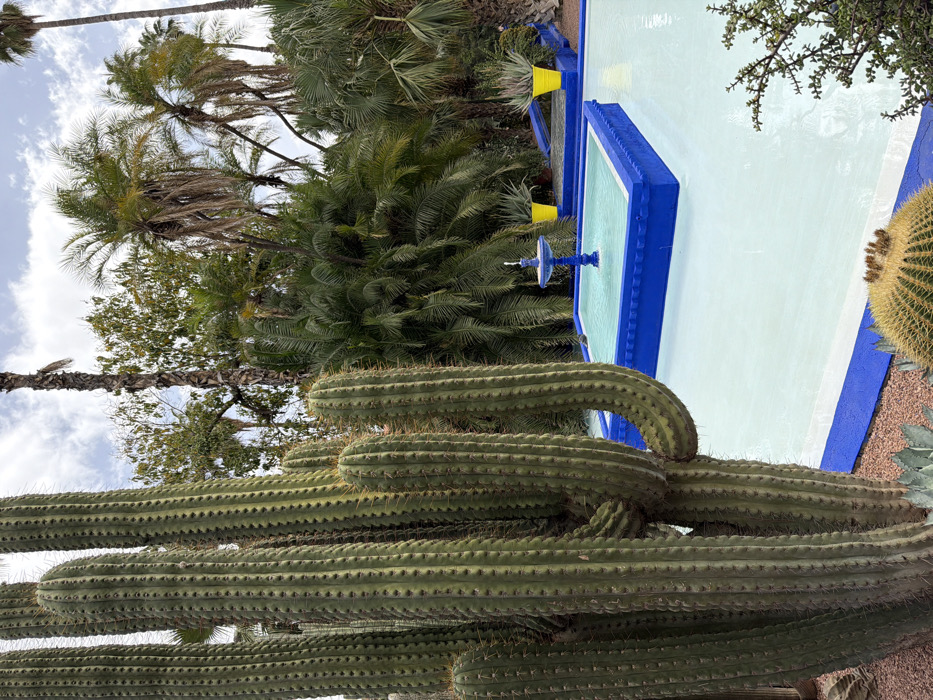 The scene depicts a section of the Majorelle Garden in Marrakesh, Morocco. In the foreground, a dense cluster of tall, columnar green cacti with prominent ribs and spines occupies the left and central portions of the frame, rooted in reddish-brown gravel. A spherical cactus and smaller succulents are visible in the lower right foreground. In the midground, a rectangular pool of light blue water is bordered by a vivid Yves Klein Blue edge. Centrally, a smaller, raised square basin, also in Yves Klein Blue, contains an ornate blue fountain actively spouting water. Beyond this, a raised platform, similarly bordered in Yves Klein Blue, features two bright yellow conical planters holding spiky, grey-green succulent plants. The background consists of a dense canopy of various green palm trees and other tropical foliage, extending upwards under a partially cloudy sky. No human figures are present.