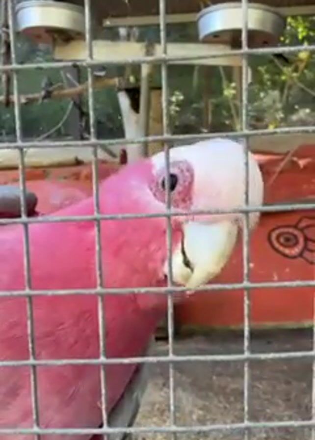 close-up of a Galah in a wire cage. The bird has pink feathers on its body and a white head. It is looking towards the left side of the frame with its beak slightly open. Behind the cage, there is a red wall with an Aboriginal-style painting on it. The background also shows green trees and some cage fixtures.