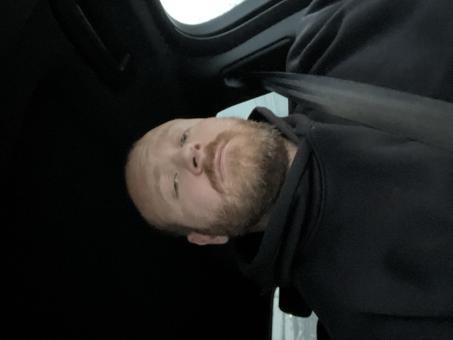 An adult male with fair skin, a balding or closely-shaven head, and a reddish-brown full beard and mustache is seated in the driver's position of a vehicle