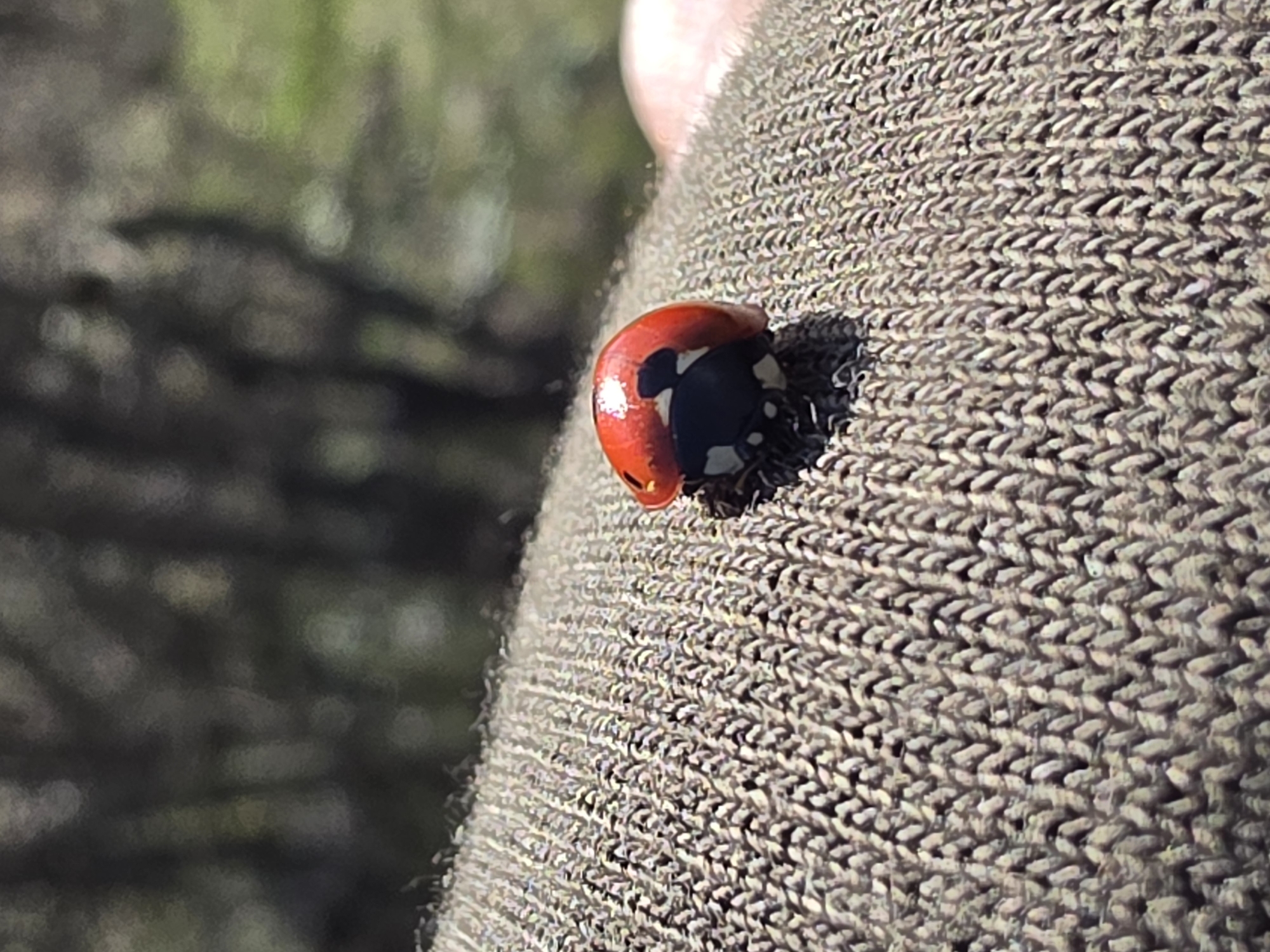 A ladybug rests on a rough, knitted brown fabric, possibly clothing