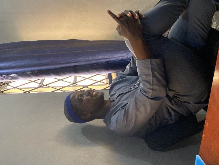 The scene depicts an interior setting within the city of Unknown, Nigeria. A male subject is seated in a dark chair, positioned facing the right of the frame. He wears a grey long-sleeved tunic, adorned with a white and black geometric pattern on the left chest area, paired with matching grey trousers. A grey cap featuring a blue horizontal band is worn on his head. His hands are interlocked, resting on his crossed legs. The subject exhibits a smiling facial expression, with his gaze directed off-frame to the right. The background consists of a light grey wall. To the subject's right, a window with a diamond-patterned security grille is visible, partially obscured by a dark blue curtain. Natural light from the window illuminates the scene, casting a shadow on the wall behind the subject. In the lower left foreground, a section of a brown wooden table is present, with a blue object resting upon it.
