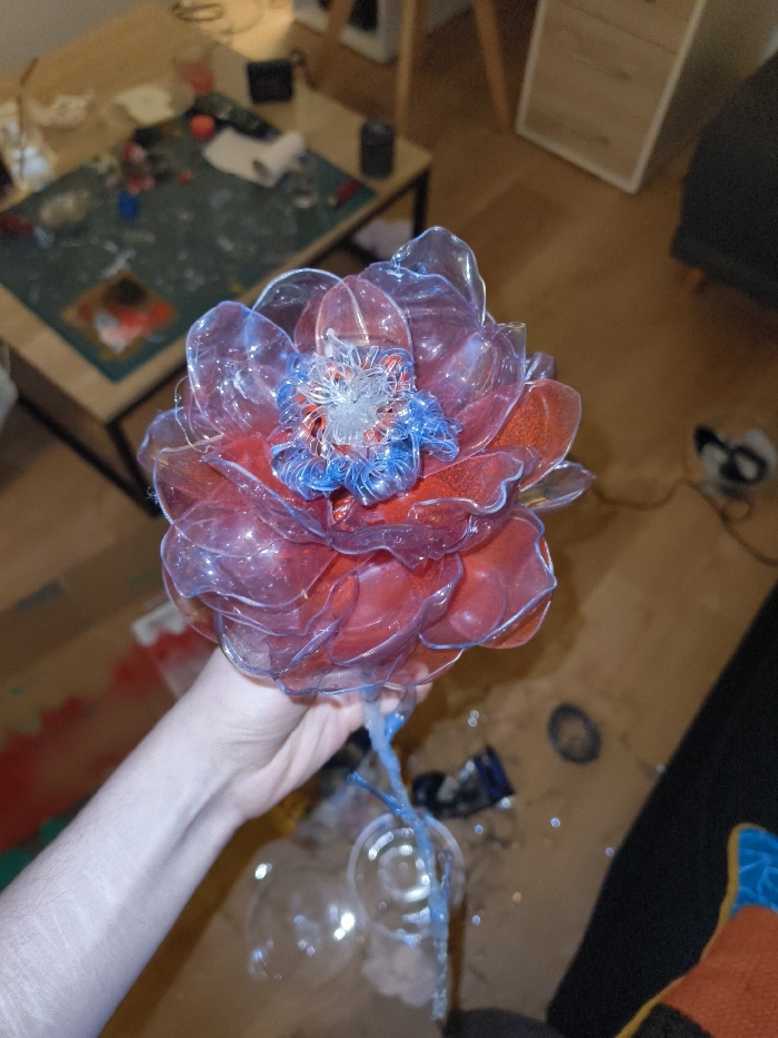 A hand holds a large, intricately crafted flower made of translucent red and blue plastic