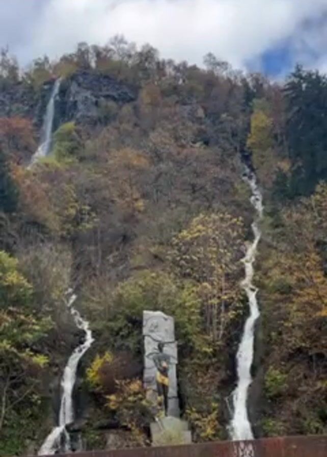 scenic landscape with two waterfalls flanking a statue. The waterfalls cascade down a mountainside covered with trees exhibiting autumn foliage. The statue, seemingly of a human figure, stands in the foreground, centrally positioned between the waterfalls. The sky is partly cloudy, with patches of blue visible.