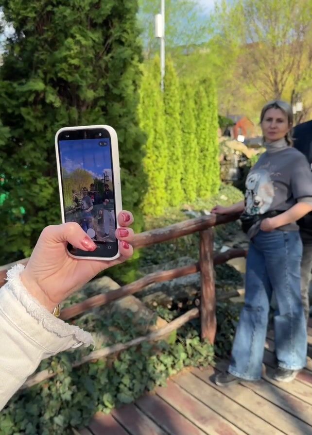A woman in a cap and jacket holds up a smartphone to photograph a group of three people. The group consists of a woman in a gray shirt and jeans, a man in a black jacket and hat, and another man with a beard wearing sunglasses and holding a red cup. They are standing on a wooden bridge with a railing, surrounded by green foliage and trees.