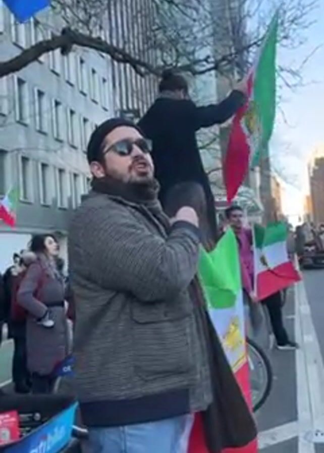 protest taking place in an urban environment. A group of people are gathered near a street, some holding and waving flags of Iran. One man is standing on someone's shoulders and waving a flag. Another man, wearing a beanie and sunglasses, is standing in the foreground speaking or chanting. Buildings are visible in the background, and a Citi Bike station is to the left. The atmosphere appears to be charged with emotion, likely related to political or social activism. The weather seems clear and cold.