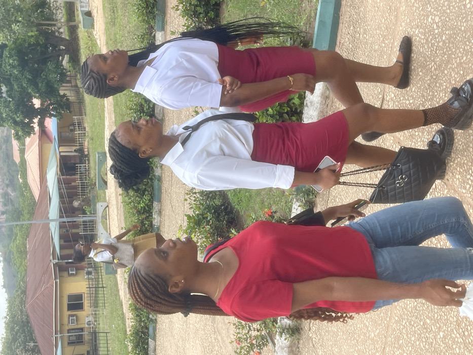The scene depicts an outdoor campus or institutional setting in Uturu, Nigeria. Four young adult females are present, walking on a paved pathway during daylight hours. In the foreground, from left to right: 1. A female with light brown skin and long, braided, light brown hair styled in a ponytail, wearing a red short-sleeve t-shirt and light blue jeans. She carries a small white object in her left hand and a black shoulder bag over her right shoulder. 2. A female with light brown skin and dark braided hair styled in a high bun, wearing a white long-sleeve button-down shirt with rolled-up sleeves and a black tie, paired with a maroon mini skirt. She carries a black quilted handbag with a chain strap in her left hand and a white smartphone in her right hand. She wears black fishnet ankle socks and black patent leather platform loafers with bow embellishments. 3. A female with light brown skin and long, dark braided hair extending down her back, wearing a white short-sleeve button-down shirt and a maroon mini skirt. Her right arm is interlinked with the left arm of the adjacent female. She wears a gold bracelet on her right wrist and flat black shoes. The second and third females are walking arm-in-arm. In the mid-ground, behind the foreground individuals, another female is walking from left to right. She has dark hair and is wearing a light tan short-sleeve top and a matching skirt, carrying a light-colored shoulder bag. The background features a large yellow building with a sloped brown roof, multiple air conditioning units on its exterior, and windows. To the right of the yellow building, another lighter-colored building with a similar roof is visible. A low metal fence and a light-colored concrete bench are situated between the pathway and the yellow building. Lush green bushes and trees line the pathway and surround the buildings. Distant hills are visible in the far background under a bright sky. The paved pathway appears to be concrete or asphalt.