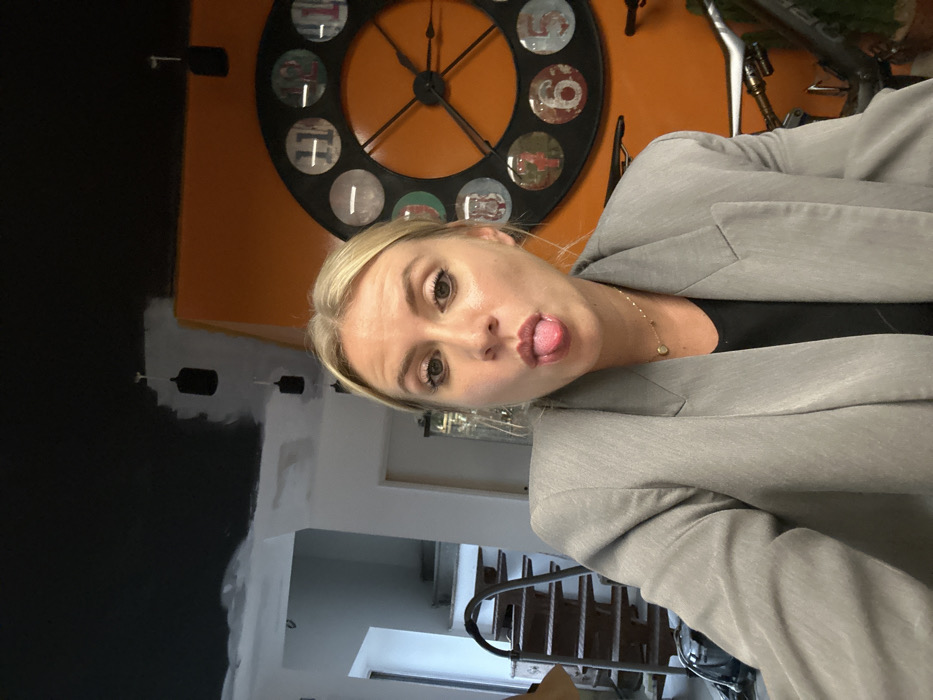An interior scene located in Saint-Médard-en-Forez, France, depicts a blonde female subject posing playfully. The subject, appearing to be an adult, is positioned centrally, facing the camera directly with her tongue extended. She wears a light grey blazer over a dark top and a delicate gold-colored necklace. Her hair is pulled back, and she has visible eye makeup. The background consists of a multi-colored interior. To the subject's right, a large, decorative wall clock with a black frame and distressed numerical markers is mounted on a bright orange wall. The clock's hands are black. To the subject's left, a light-colored wall features an opening revealing a multi-level staircase with visible treads and risers. The ceiling above is partially painted black, with patches of white primer visible, indicating ongoing work or a stylistic choice. Multiple black, cylindrical pendant lights hang from the ceiling. A metallic object, possibly a bicycle handlebar, is partially visible in the lower right foreground. The environment suggests an indoor space with modern or industrial design elements, possibly undergoing renovation.
