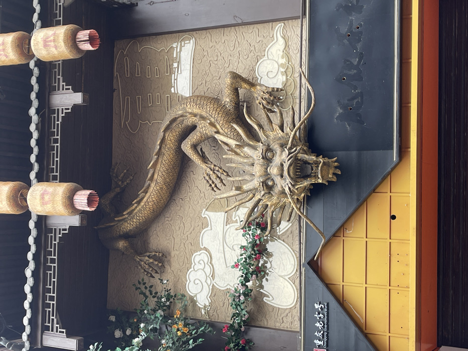 A gilded dragon sculpture clings to a textured beige wall adorned with stylized clouds