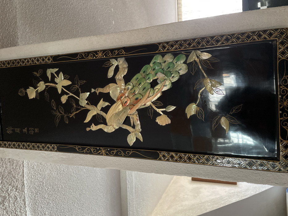 A black lacquer panel displays a mother-of-pearl inlay depicting a bird, possibly a peacock, perched among flowering branches