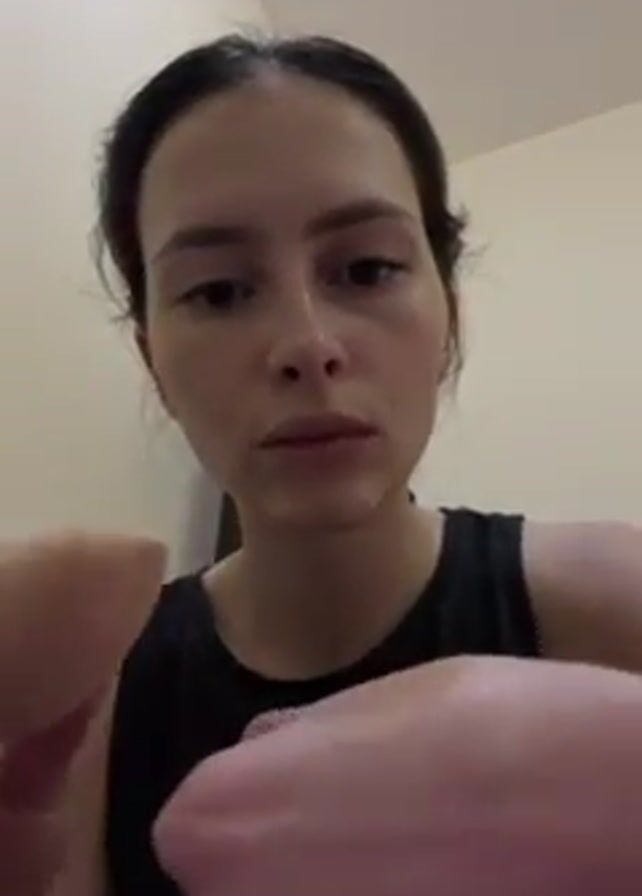 A woman with her dark hair pulled back and wearing a black tank top is shown from the chest up, against a light yellow wall