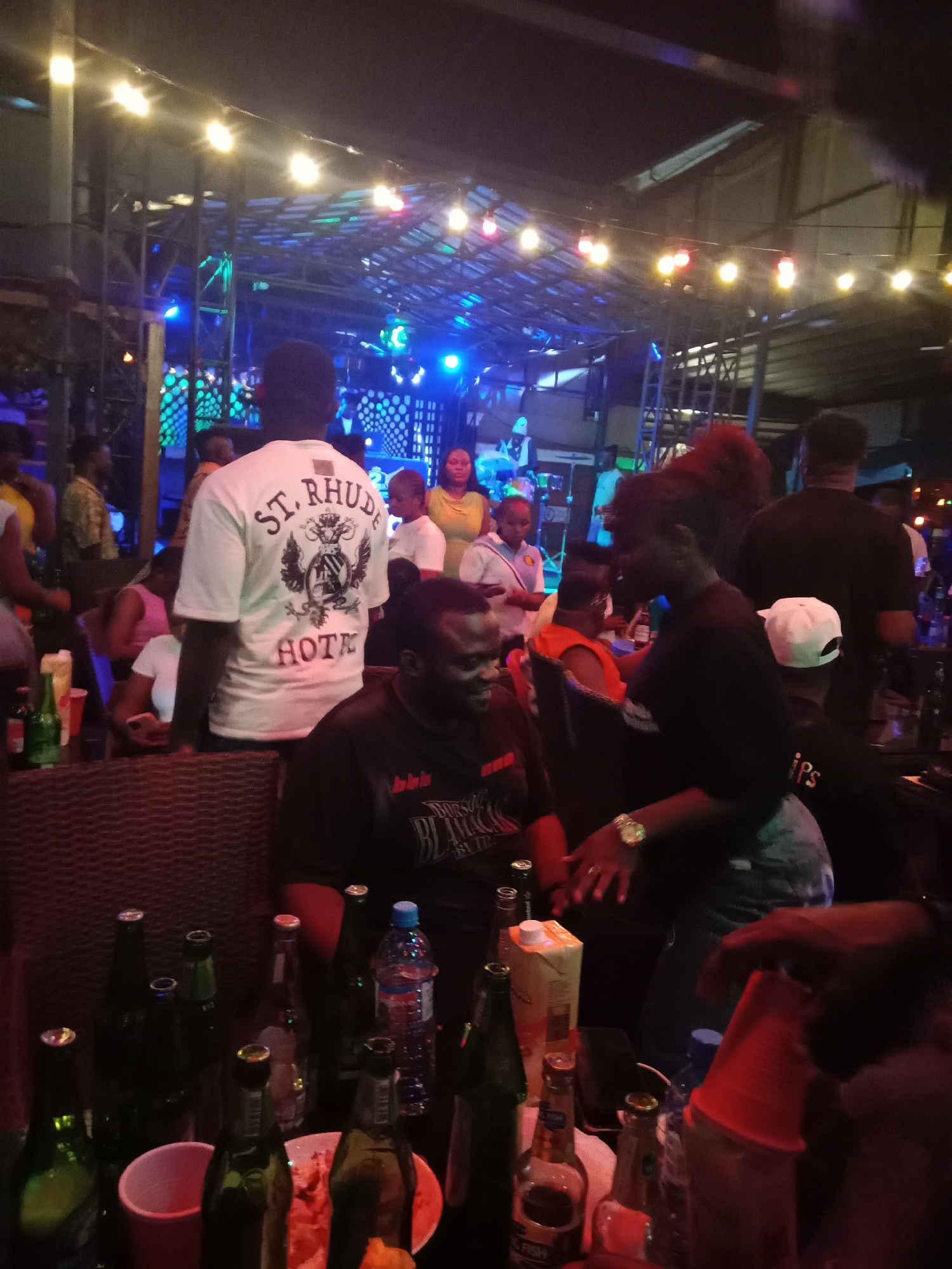 The image depicts an active nighttime social gathering at a semi-enclosed outdoor venue in Obosi, Nigeria. The environment is illuminated by numerous string lights of various colors (warm white, blue, green, red) strung across a metal scaffolding structure and a visible corrugated roof. Approximately 20-30 individuals, primarily adults, are present. In the foreground, a man wearing a black t-shirt with "Borson Blamac" text is seated, smiling and looking right. Behind him, another man, facing away from the camera, wears a white t-shirt featuring a "ST. RHUDE HOTK" graphic. A third individual, partially visible on the right, wears a white baseball cap backward and a black t-shirt. Various other patrons wear casual attire. One person in the mid-ground displays a gold-colored watch on their left wrist. Tables in the foreground and mid-ground hold numerous beverage containers. These include multiple empty and partially consumed green and brown glass beer bottles, plastic water bottles, a carton of juice, and red plastic cups. One table also contains a plate with food remnants. In the background, a stage area is visible with blue and green lighting, featuring elements consistent with a performance setup, including drums and decorative panels with circular patterns.