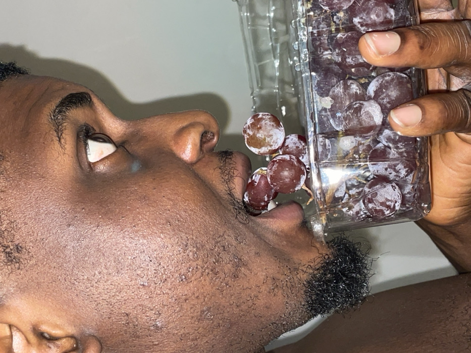 - "A close-up captures a Black man tilted back, his mouth open to receive grapes from a clear plastic container held in his right hand" by FM-wvSkE2, licensed under CC BY 4.0