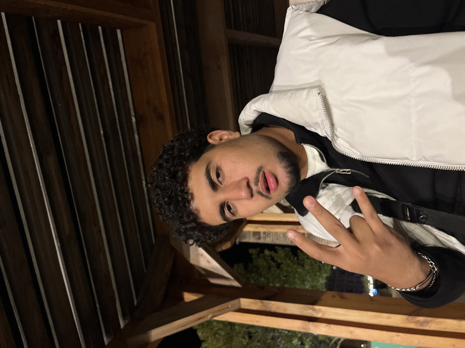 A young adult male, appearing to be in his twenties, is shown in a medium close-up, facing the camera directly under dim, likely artificial, lighting. He has dark, curly hair, a mustache, and a short beard. He wears a white quilted puffer vest over a black full-zip jacket, which in turn covers a light-colored undershirt. A dark shoulder bag strap crosses his chest. On his left wrist, he wears a silver-colored chain bracelet and a dark cord bracelet. His left hand is raised to approximately chest height, forming a gesture with the index finger and pinky extended, and the middle and ring fingers curled into the palm. His mouth is slightly open. The background indicates an outdoor or semi-outdoor setting at night, characterized by a visible wooden overhead structure consisting of horizontal slats and vertical support beams. Faint, blurred lights and dark foliage are discernible in the distance. The environment is consistent with an outdoor dining area or public space found in an urban setting such as Marseille, France. No specific landmarks are visible to identify an exact location within the city.
