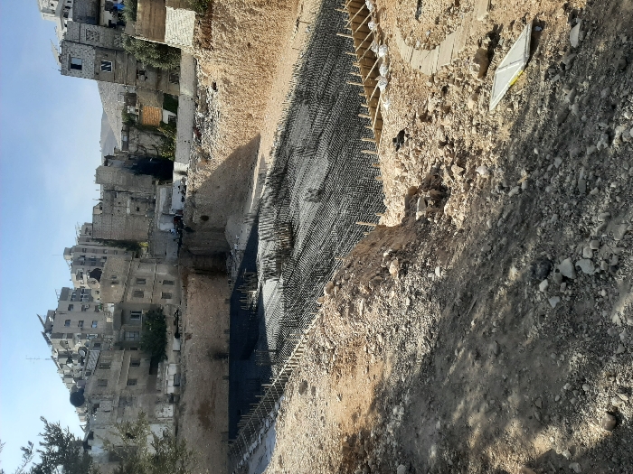 The image displays an active construction site within Barza Municipality, Syria, under clear daylight conditions. The foreground is dominated by a large, rectangular excavation pit, approximately two to three stories deep, with exposed light-brown earthen walls. Within the pit, an extensive grid of steel rebar, forming a foundation mat, covers a significant portion of the excavated area. On the right side of the pit, timber formwork elements are visible, prepared for concrete pouring. The ground in the immediate foreground and around the pit edges consists of disturbed, rocky soil and construction debris. A flat, white rectangular panel lies on the ground in the lower right quadrant. The background features a densely built-up residential area on a hillside, composed primarily of multi-story concrete and masonry buildings exhibiting a worn appearance. Several buildings have rooftop water tanks or other installations. Sparse green vegetation, including a tree on the left, is visible among the structures. A distant, arid mountain range or elevated terrain is visible against a clear blue sky. No human figures are present in the scene.