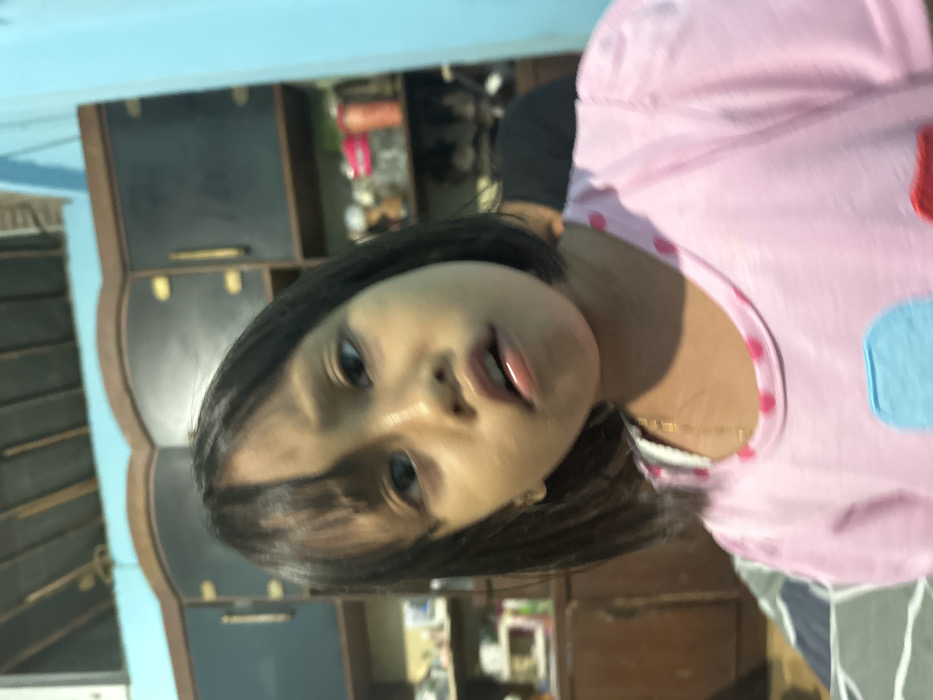 A young girl with dark hair and light skin is wearing a pink shirt with polka dots. She's indoors, positioned in front of a dark cabinet. The background includes a blue wall and glimpses of various household items on shelves. The photo has been rotated, placing the girl's face in a tilted perspective. The girl is gazing directly at the camera with a slightly parted mouth.