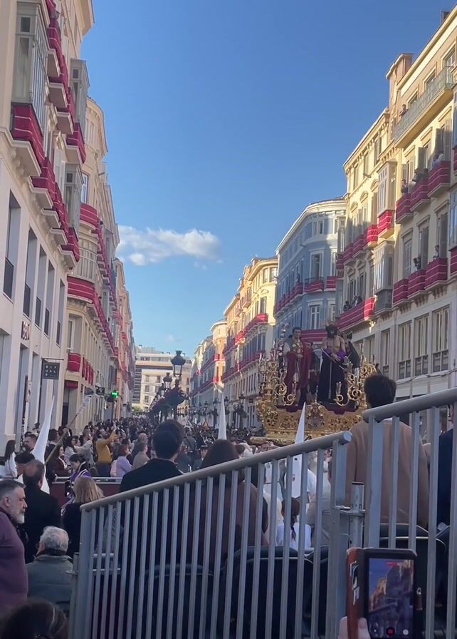 street scene in what appears to be a European city, possibly in Spain given the architecture and the religious procession. The street is lined with tall buildings, painted in hues of beige, white, blue and accented with red trim around balconies. The sky is a clear, vibrant blue. A large crowd of people are gathered on the street, many standing behind metal barricades. A religious float, adorned with gold and carrying figures in traditional robes, moves slowly down the street. Some individuals in the crowd are holding white flags or banners. A person in the foreground is holding a tablet, seemingly recording the procession. The atmosphere is festive, yet reverent, likely during a religious holiday or celebration.
