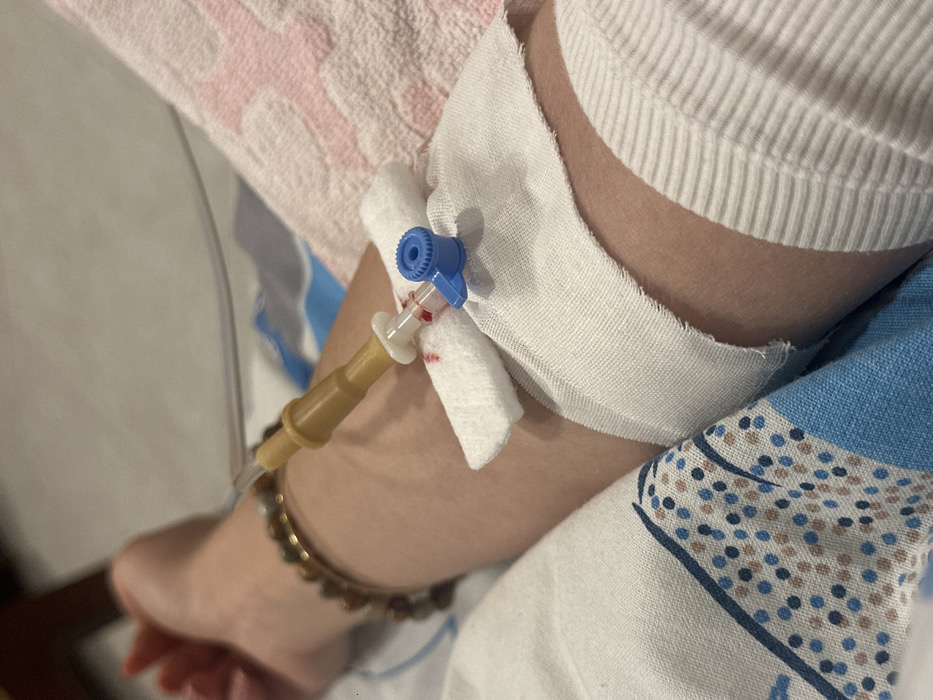 The image presents a close-up view of a human left forearm and wrist. An intravenous (IV) catheter is inserted into the arm, secured by white medical tape over a small white padding beneath the catheter's hub. The catheter itself consists of a yellowish-brown hub, a clear tube extending from it, and a white injection port capped with a blue luer lock. Traces of red liquid, consistent with blood, are visible at the insertion point and on the white injection port. A multi-beaded, light brown bracelet is worn on the wrist. The arm is covered by a light-colored, possibly white, long-sleeved garment featuring horizontal ribbing. The arm rests on patterned bedding, characterized by a white fabric with blue and brown polka dots and a separate segment of pinkish-white patterned fabric. The precise location within the city of Yerevan, Armenia, cannot be determined from the visual information provided.