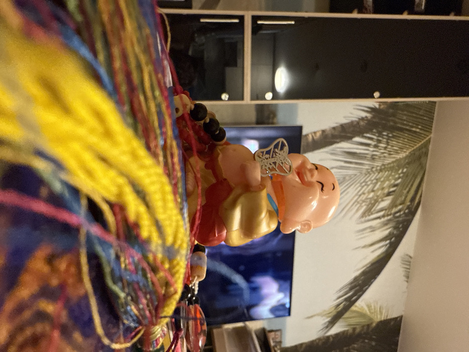 A whimsical decoration is hanging in front of a modern interior. A small, golden and pink Buddha figure is adorned with a silver charm and hangs alongside colorful, braided threads. The background reveals a dark cabinet above a palm tree print, with a television screen displaying an abstract blue image.