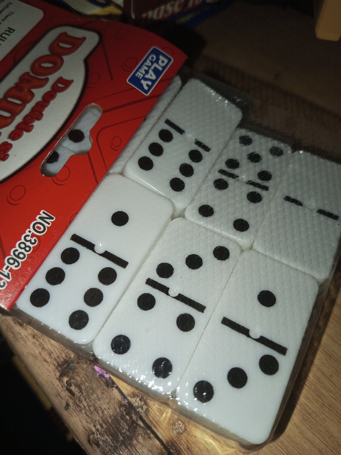 A set of white dominoes in a red and white box labeled "Double Dominoes" and "Play Game" sits on a wooden surface