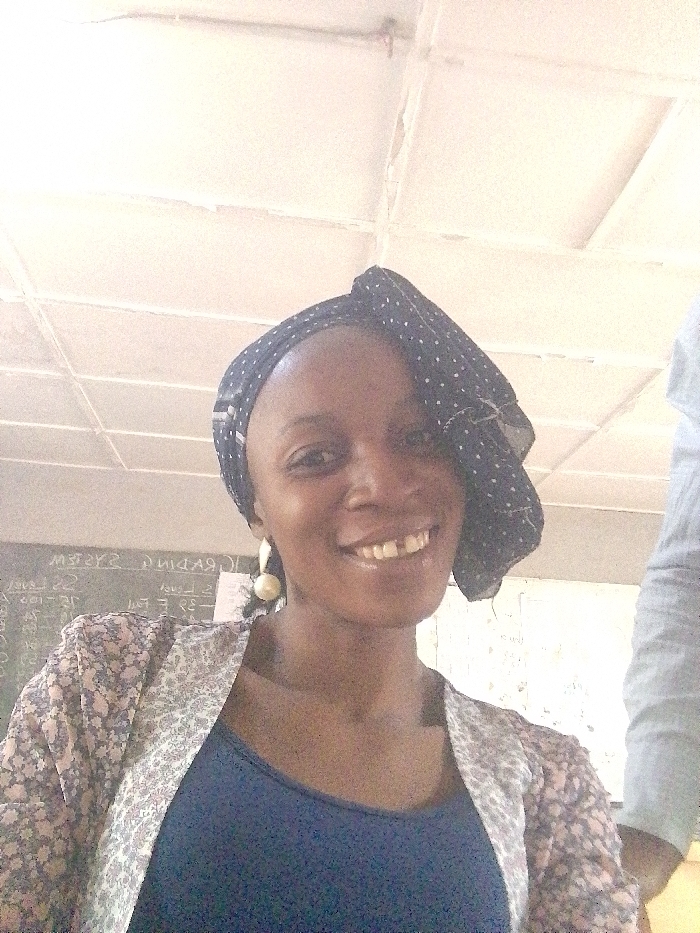 An indoor portrait taken in Barnawa, Nigeria, features a woman smiling at the camera. She has dark skin, wears a dark blue headscarf with white polka dots, a dark blue top, and a light-colored, patterned open cardigan. White, spherical pearl-like earrings are visible on her ears. Her mouth is open in a smile, revealing a distinct gap between her two front upper incisors. To the immediate right, a portion of another individual, dressed in a light blue or grey long-sleeved shirt, is partially visible. The background consists of a dark surface, likely a chalkboard or whiteboard, displaying inverted white text including "READING SYSTEM" and numerical sequences such as "22 Level". Above, a light-colored, possibly tiled ceiling shows minor imperfections. The scene is brightly lit.
