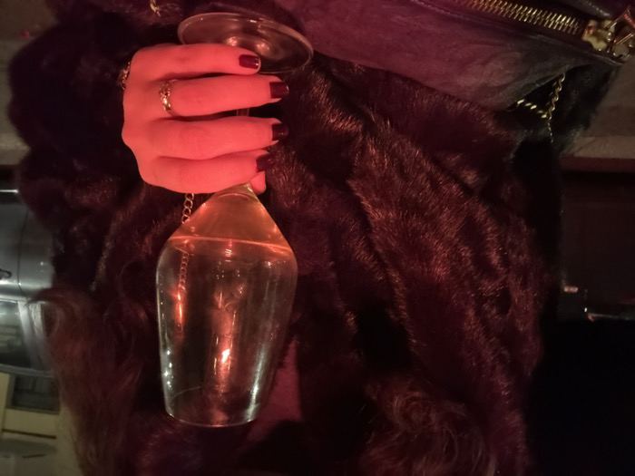 A hand with dark red nail polish and a ring holds a champagne glass filled with a light-colored liquid. The glass is held upside down. The background includes a furry dark brown coat and a dark gray or black leather bag with a gold zipper. The lighting is dim, casting a reddish hue over the scene.