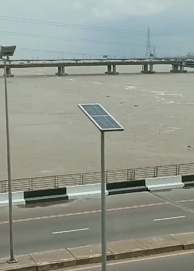 wide, grey-brown river, likely an estuary or large river close to the coast, viewed from an elevated position. A bridge spans the river in the background, with electrical pylons visible beyond. The foreground features a multilane road with traffic, including motorcycles, cars, and vans. A person is seen walking along the shoulder of the road carrying bundles of materials. The sky is overcast, suggesting a cloudy or potentially rainy day. There are solar powered lights along the side of the road. Buildings are visible in the distance, on the other side of the river.