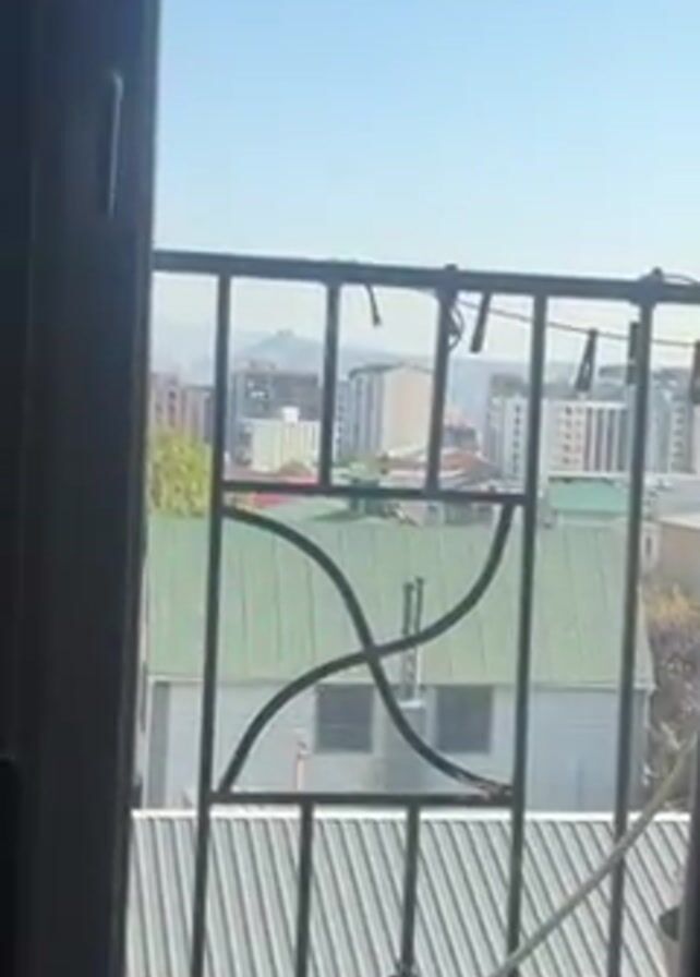The camera zooms in through a black metal balcony railing with a decorative design toward a cityscape on a sunny day. The view includes multiple buildings of varying heights and colors, with green and red roofs visible among the structures. In the distance, a prominent hilltop with a fortress or significant structure on top is visible against the light blue sky. Clothes are hanging on a balcony of one of the buildings.
