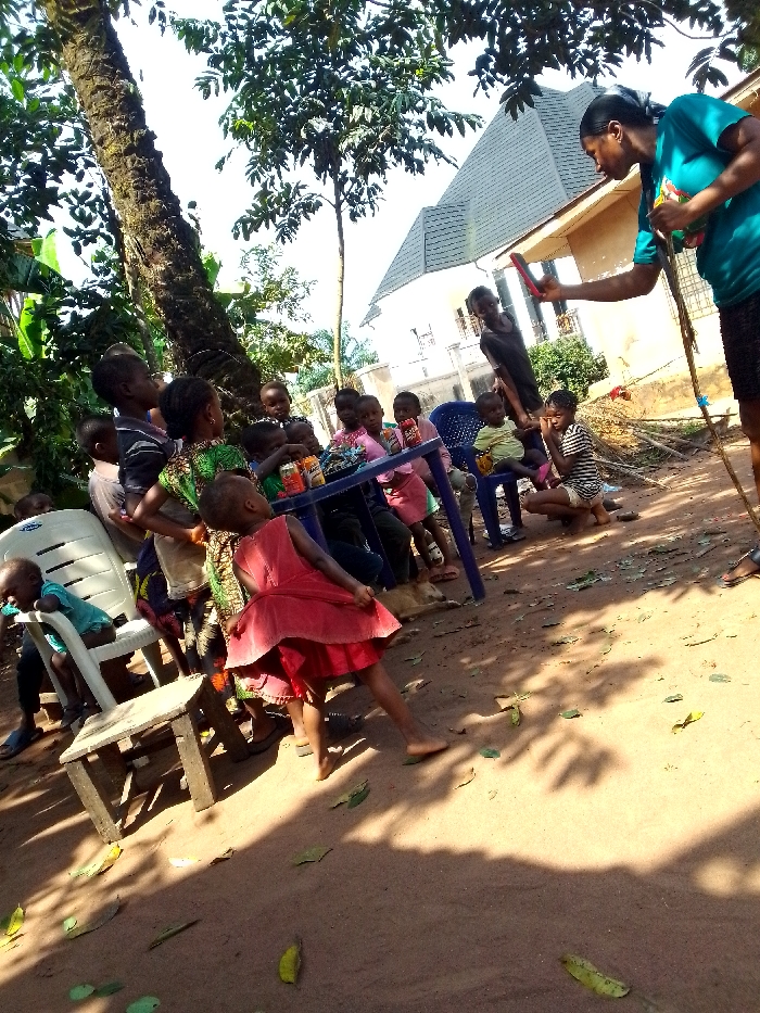A group of children gathers around a blue table outdoors, with cans and snacks placed on top. An adult woman in a teal shirt stands nearby, holding a red object and a walking stick, seemingly engaging with the kids. Some children are seated on chairs, while others stand or sit on the ground. A girl in a red dress stands out in the foreground. Leaves are scattered on the ground, and a house is visible in the background.