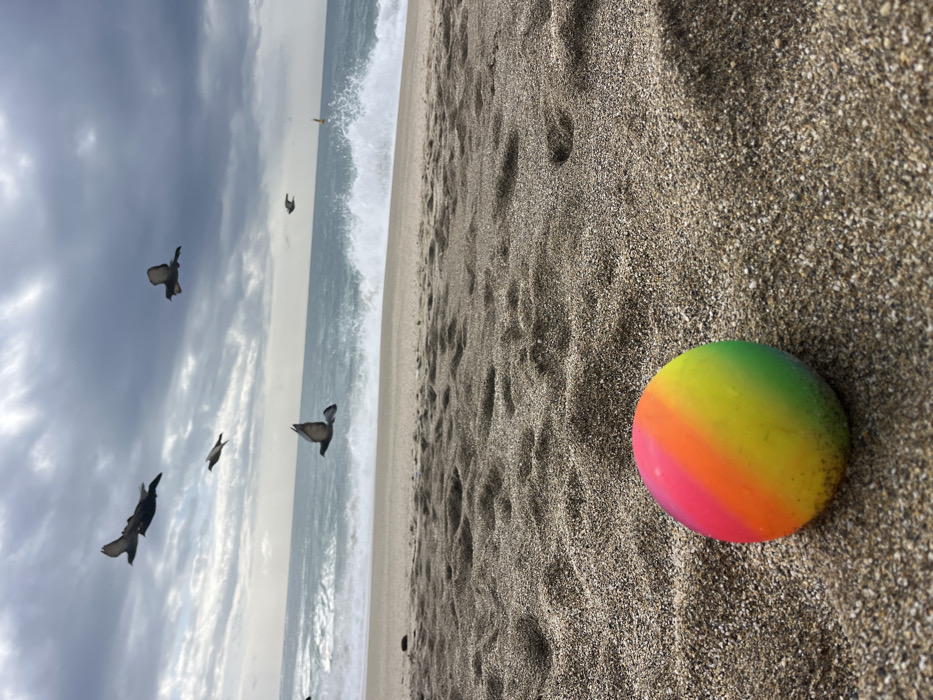 The image depicts a beach scene in Alanya, Turkey, under an overcast sky. In the foreground, a multi-colored spherical object, appearing to be a ball with distinct horizontal stripes of pink, orange, yellow, and green, rests on coarse, light brown sand. The sand shows various textures and small depressions. The midground features a sandy beach meeting the Mediterranean Sea, where multiple white-capped waves are actively crashing onto the shore, indicating turbulent conditions. In the sky above the sea, five dark-plumaged pigeons are captured in various stages of flight across the frame. The sky is largely covered by dense, dark grey and white clouds, suggesting an overcast environment. A small, distant yellow object is visible on the water's surface towards the right side of the frame. No human subjects are present.