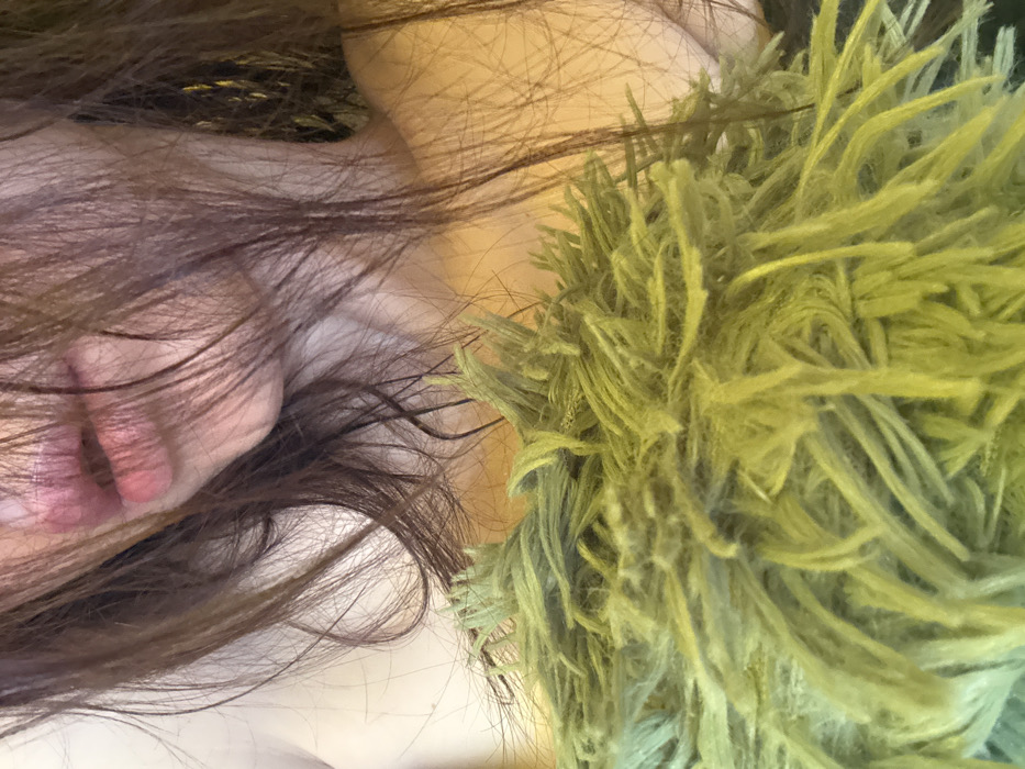 The image presents a close-up, cropped view of an individual's upper body, specifically from the mouth to the upper chest, in an indoor setting in Toksovo, Russia. The subject's mouth is visible, featuring slightly parted, pink-hued lips. Dark brown, moderately disheveled hair partially obscures the face, neck, and a vibrant lime-green, shaggy-textured garment. The right side of the individual's neck and a portion of the upper chest are visible, displaying light skin. The green material appears to be part of clothing or an accessory worn by the subject. The background is an undifferentiated warm, yellowish tone, offering no further environmental context or specific location markers within Toksovo. No discernible actions or interactions are depicted beyond the subject's presence and attire.