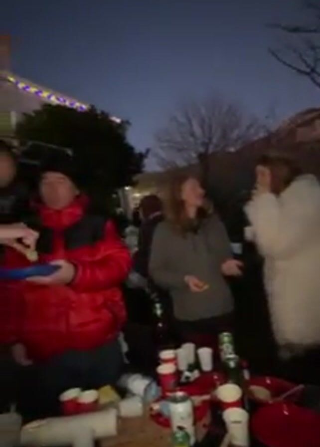 At dusk, people are gathered at an outdoor party. A man in a tan coat feeds another man in a red jacket a bite of something from a blue plate. There are several people standing around a table covered with beer bottles, red cups, and plates. A woman in a white fur coat stands near the table with another woman in a gray hoodie. A house with lights on it is in the background. The sky is a deep twilight blue.