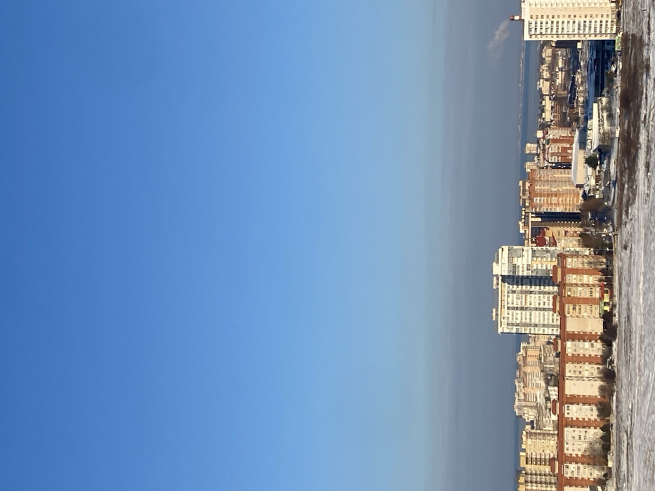 A bright blue sky fills a large portion of the image. Adjacent to the sky is a muted grey expanse, possibly a body of water. The right edge displays a cityscape with numerous apartment buildings and what looks like snow-covered ground. The buildings appear to be mostly white and brown. The photograph is oriented vertically with the buildings and land in the lower portion and the sky above.
