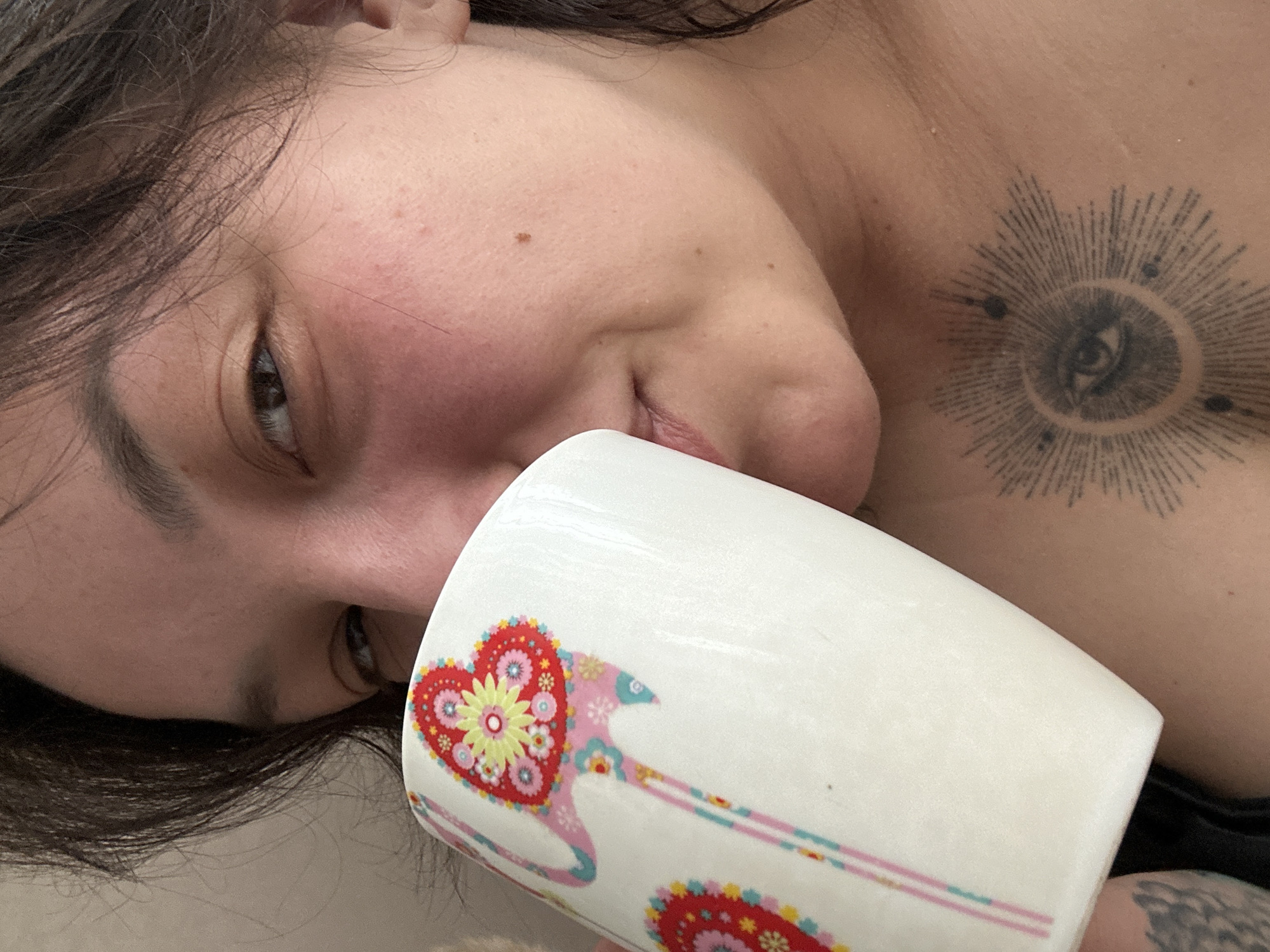 A person is lying down and holding a white mug with heart-shaped designs. The person has dark hair, and a tattoo of an eye surrounded by radiating lines is visible on their chest. The scene appears to be indoors. No elements directly identify Chaikovsky, Russia.
