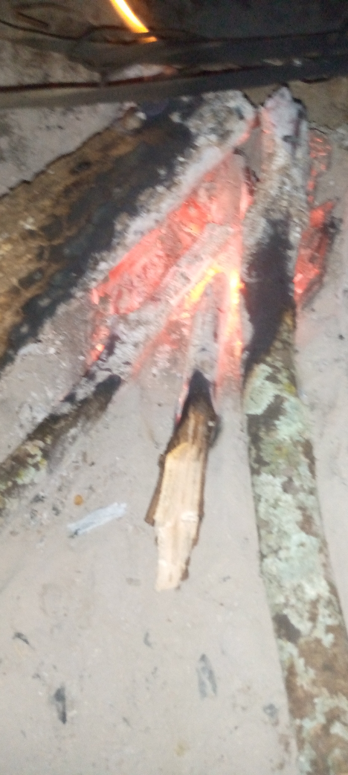 The image displays a ground-level fire consisting of several pieces of wood on light grey earth. Multiple logs exhibit active combustion, characterized by prominent orange-red embers and glowing light concentrated towards the upper-center and right. Other wood pieces are partially consumed, covered in light grey ash and dark charred sections. A lighter, unburnt piece of wood is positioned in the lower-center among the burning material. To the far left, a longer, charred branch is partially visible. The ground is a light, dusty grey, with scattered dark stains and ash. A small, white, rectangular piece of debris lies on the ground in the lower-left quadrant. The upper portion of the frame is dark and out of focus, showing an indistinct orange glow, possibly from an overhead light source or reflection. No individuals are present in the scene. The informal nature of the ground fire and raw earth suggests a non-formalized outdoor or semi-outdoor setting, consistent with residential areas or informal settlements within Nairobi, Kenya, where such fires are used for purposes like cooking, heating, or waste disposal. No specific landmarks or unique architectural features are present to determine an exact location within the city.