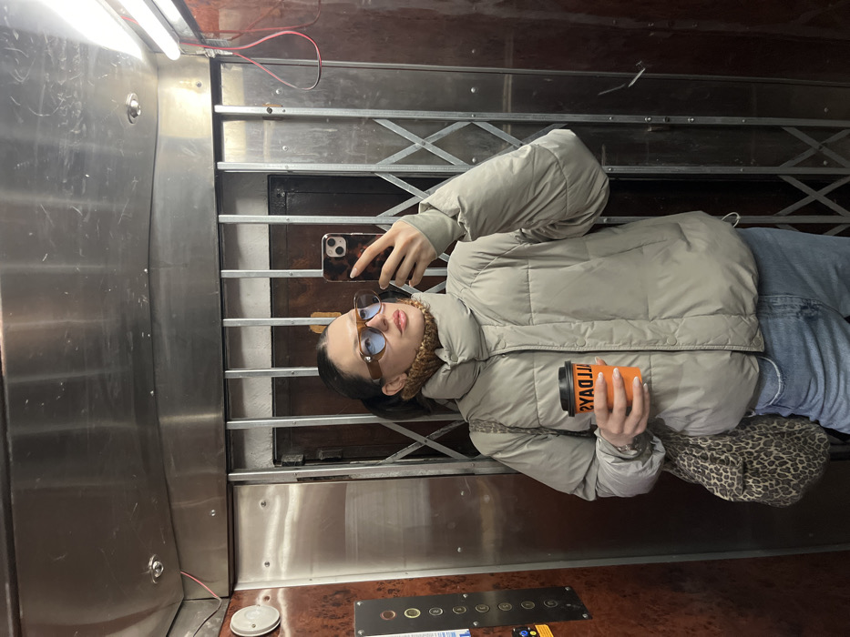 A young adult female is depicted taking a mirror selfie inside an older elevator in Sofia, Bulgaria