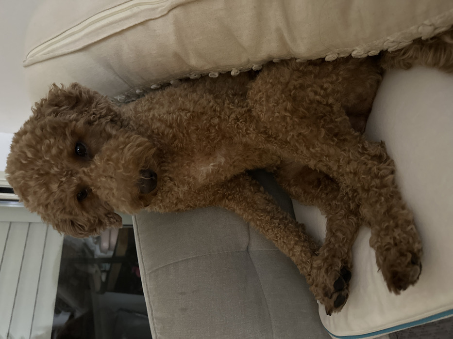 - "The image displays a medium-sized canine, specifically a dog with dense, curly auburn fur consistent with a Poodle or Poodle-mix breed, situated indoors in Rishon LeZion, Israel" by FM-Z1DMO2, licensed under CC BY 4.0