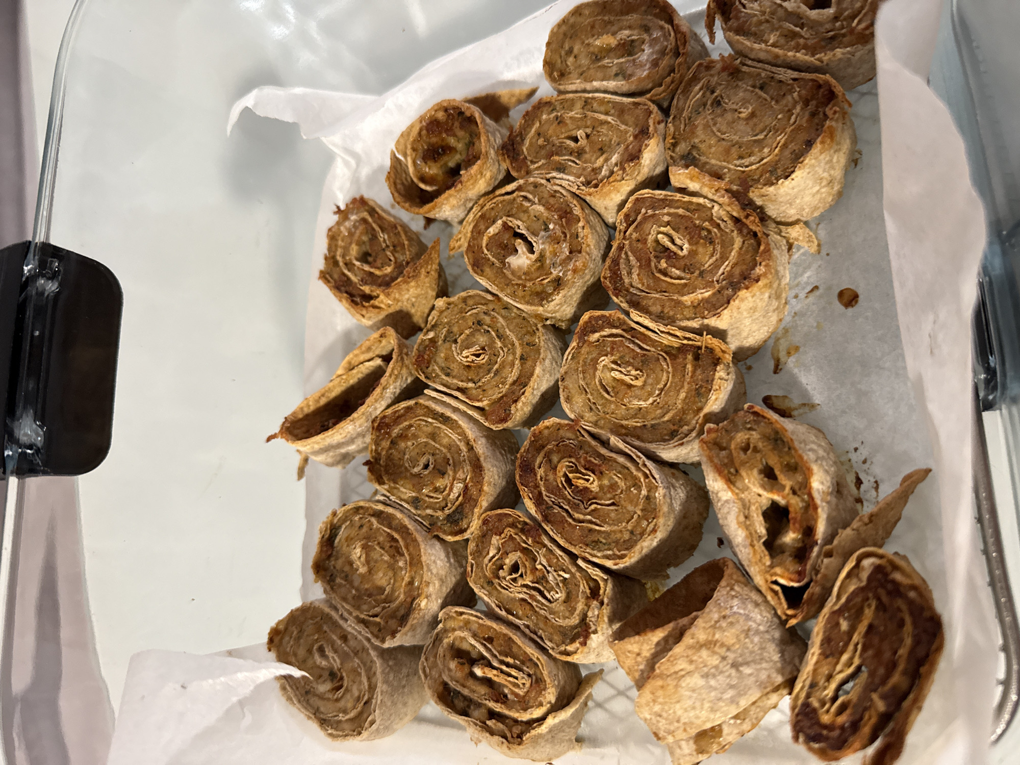 A clear, rectangular glass container, partially visible from an overhead perspective, contains approximately 25-30 cylindrical, pinwheel-shaped food items